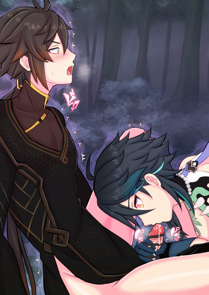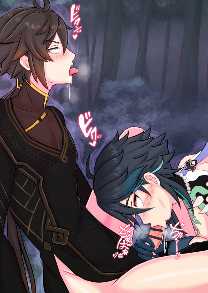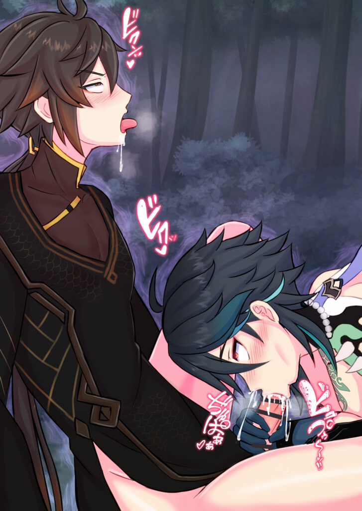 さすがの鍾離もひとたまりもなかった。彼もまた白眼を剥いてアヘ顔を晒し、魈の口の中へビュルビュルと帝君ザーメンを放出してしまう。大量の子種は出したそばから魈の喉へと吸い込まれていく。