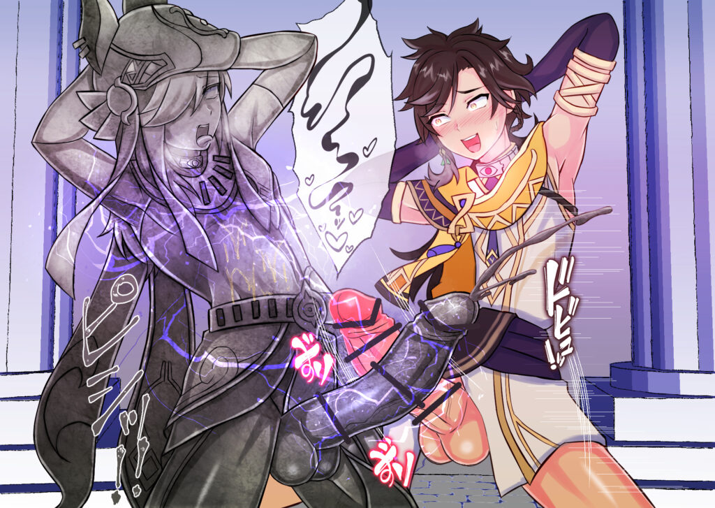 だが若く精悍なセノといえども、これだけの質量を勃起させるのは簡単ではなく、裸の女体を妄想したり、目の前のセトスの裸体を凝視したり、先ほどのティナリの痴態を思い出したりと、ありとあらゆるスケベな妄想を呼び起こして懸命にペニスを勃たせていく。
